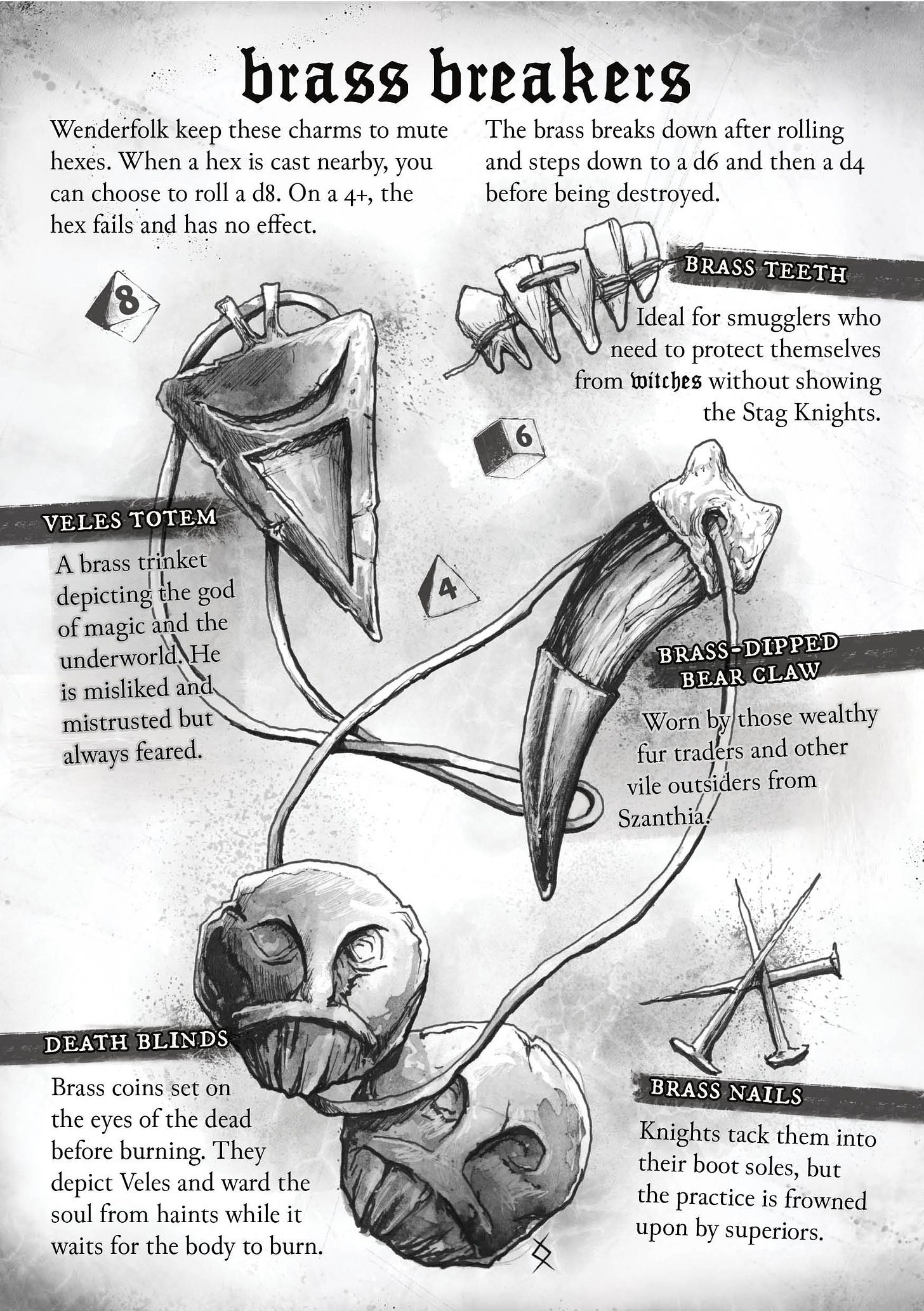This borrows from the traditional apotropaic metal in our own world. In the Wenderweald, brass doubles as a game mechanic and as a social symble that can open doors or close them forever depending on which side of the walls you’re on.